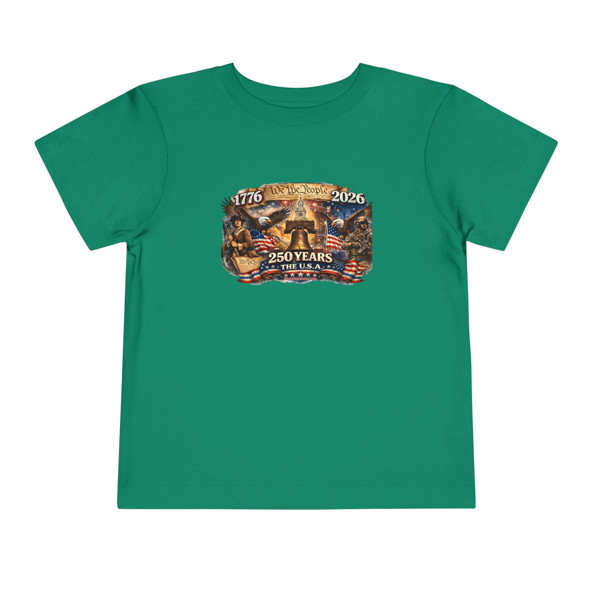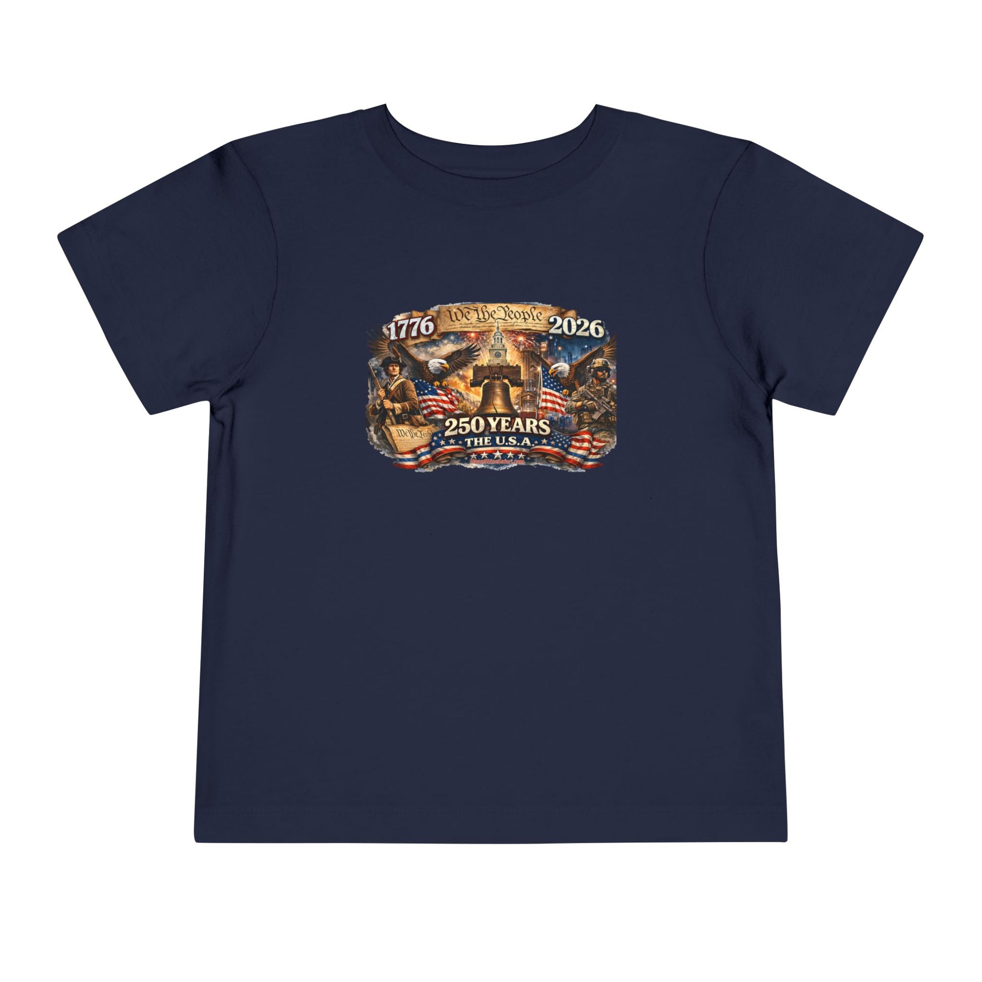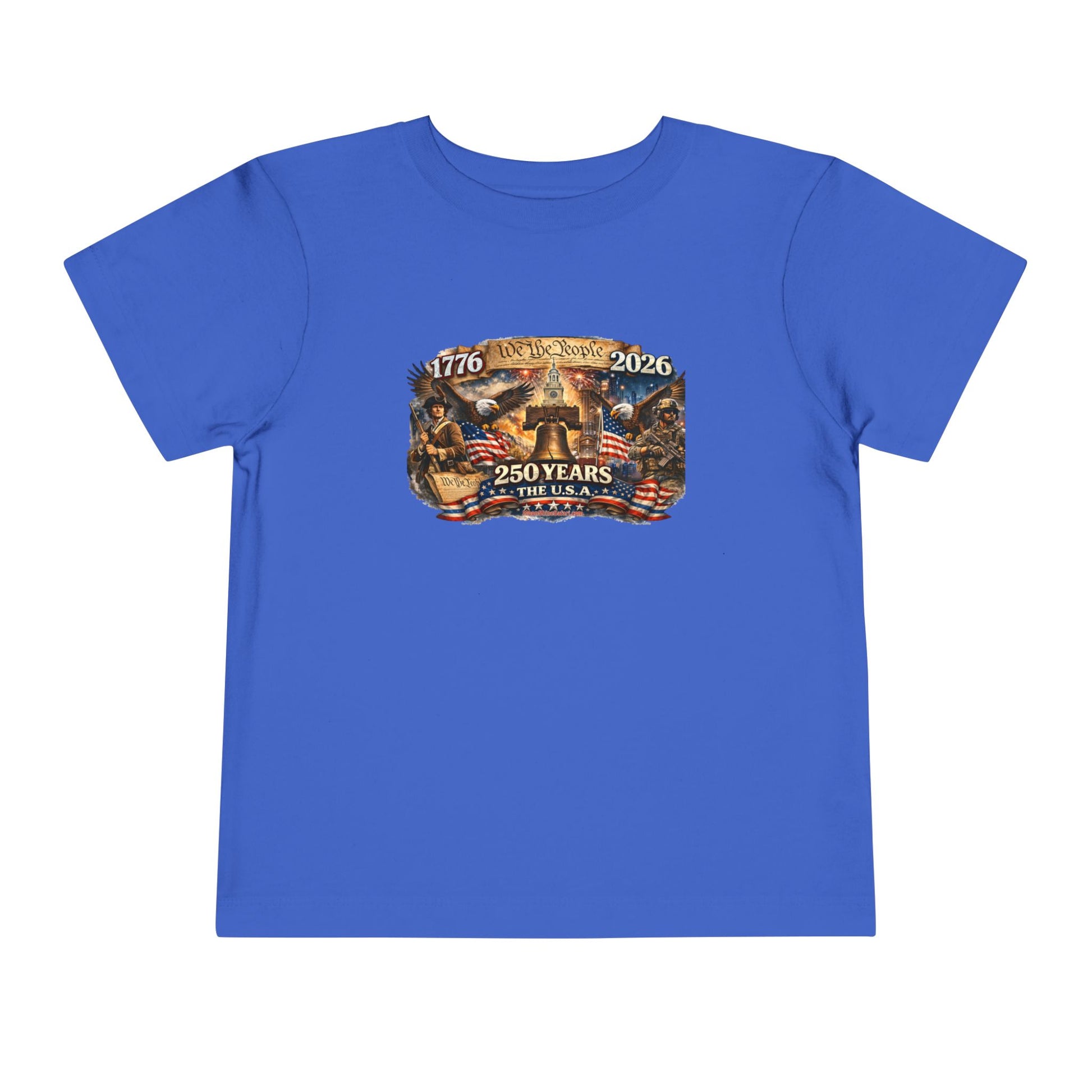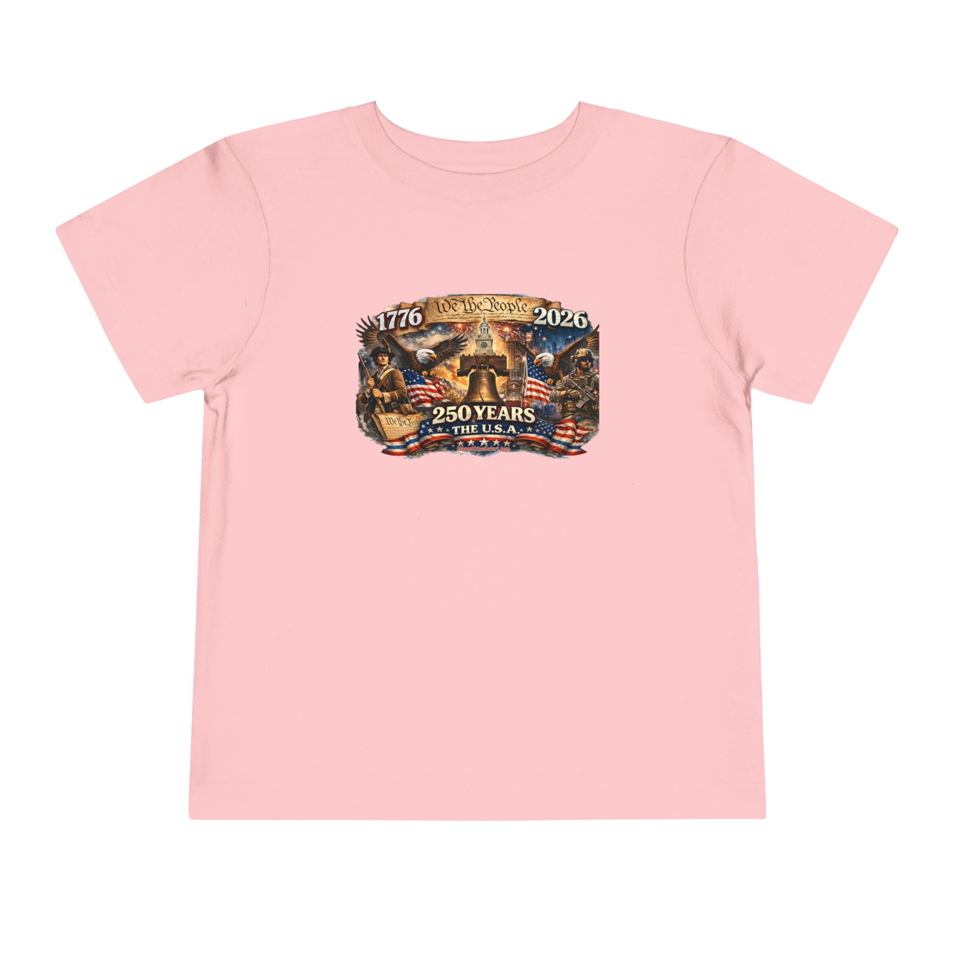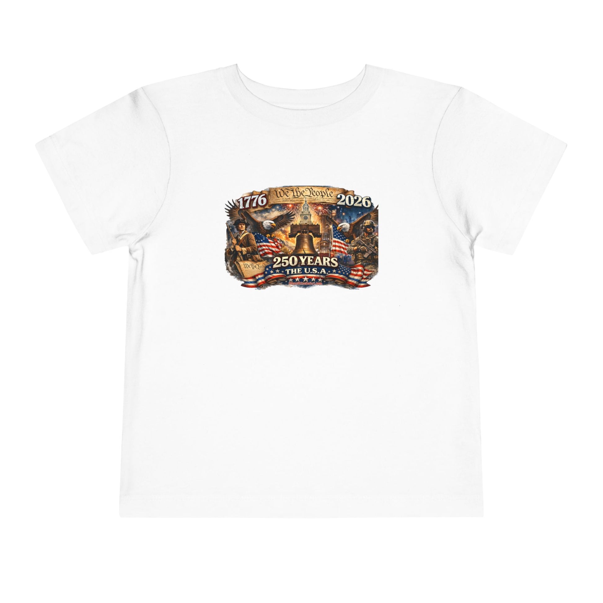 This ain’t just a toddler tee — it’s a tiny tribute to 250 years of American grit, courage, and red-white-and-blue backbone. Featuring bold vintage artwork with the Liberty Bell front and center, soaring eagles, 1776–2026 pride, and a powerful blend of historic roots and modern strength, this shirt lets your little firecracker celebrate freedom in full-color style.